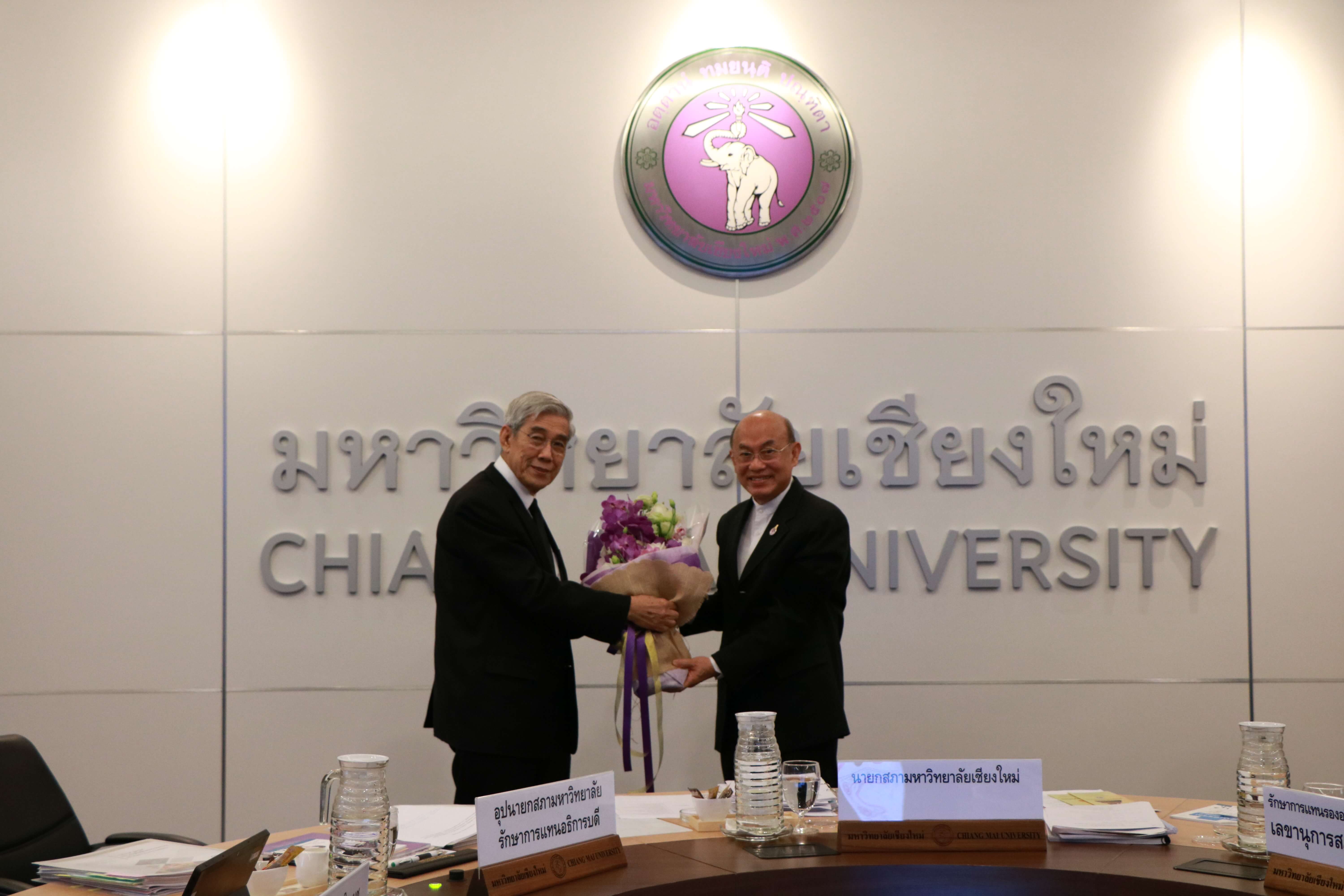 ศาสตราจารย์เกียรติคุณ นายแพทย์อาวุธ ศรีศุกรี อุปนายกสภามหาวิทยาลัยเชียงใหม่ รักษาการแทนอธิการบดีมหาวิทยาลัยเชียงใหม่ มอบช่อดอกไม้แสดงความยินดีกับศาสตราจารย์เกียรติคุณ นพ.เกษม วัฒนชัย นายกสภามหาวิทยาลัย ในโอกาสที่ได้รับพระราชทานปริญญาแพทยศาสตรดุษฎีบัณฑิตกิตติมศักดิ์จากมหาวิทยาลัยนวมินทราธิราช ในคราวประชุมสภามหาวิทยาลัยครั้งที่ 05/2560 เมื่อวันที่ 27 พฤษภาคม 2560 ณ ห้องประชุมตะวัน กังวานพงศ์ อาคารยุทธศาสตร์ สำนักงานสภามหาวิทยาลัย