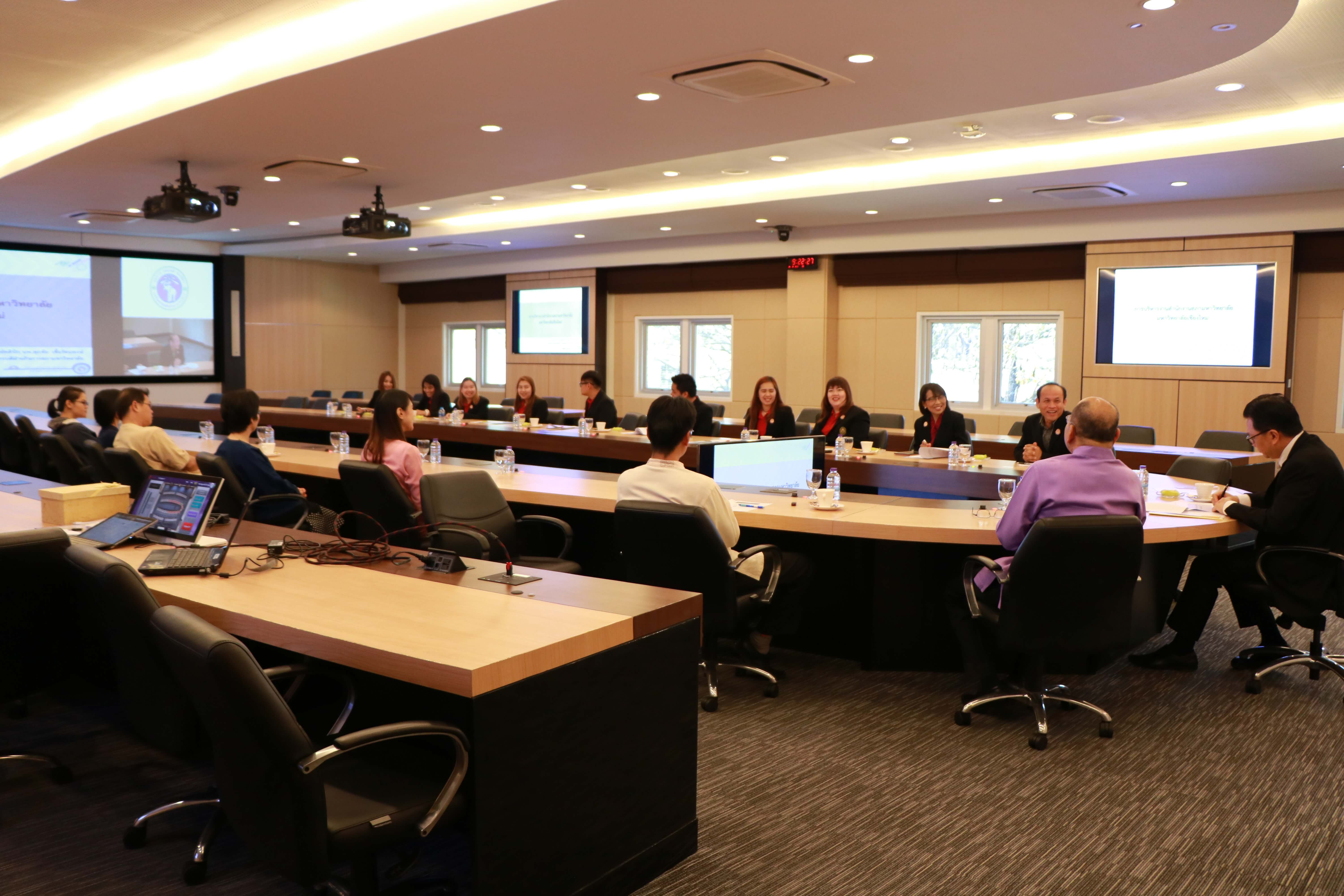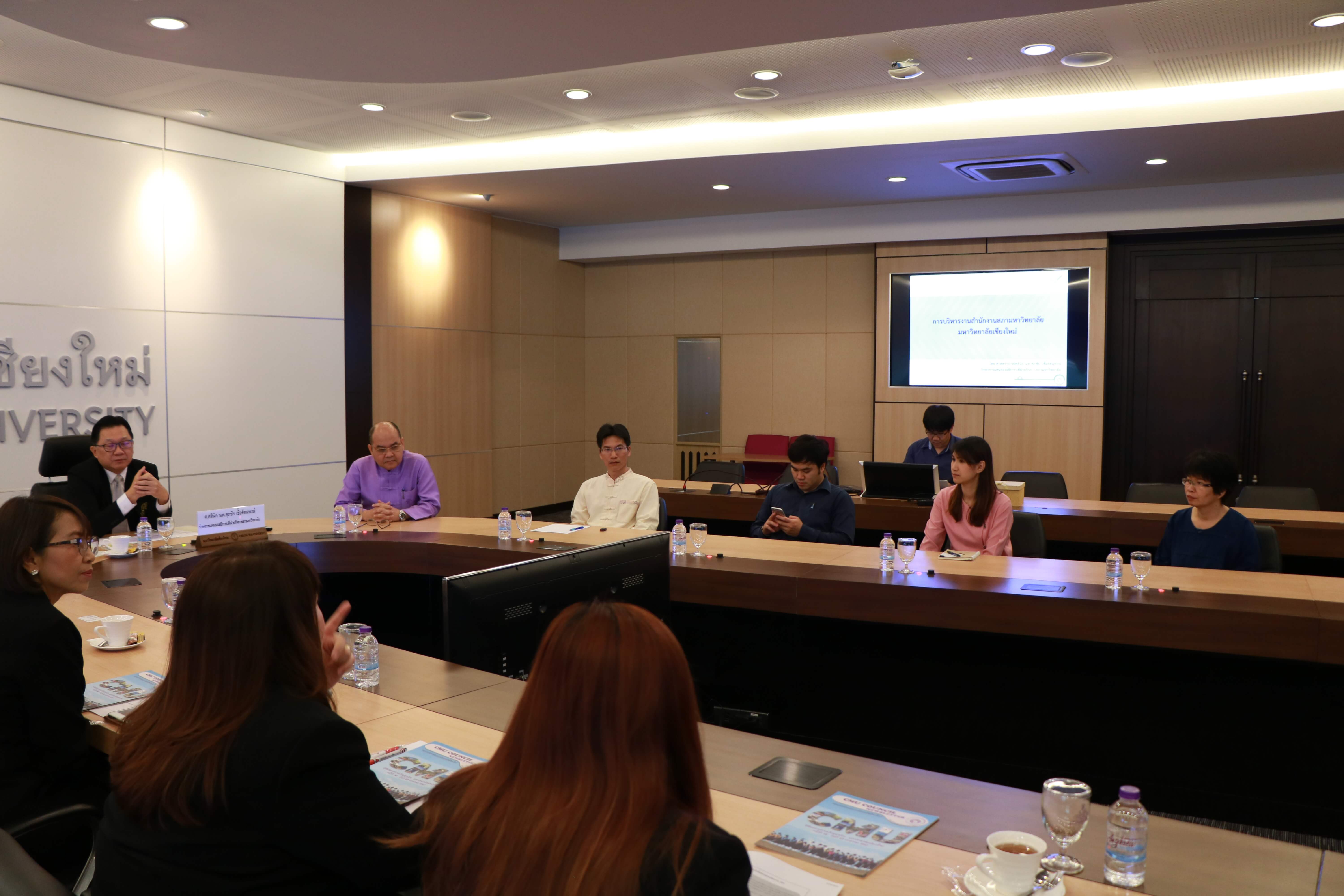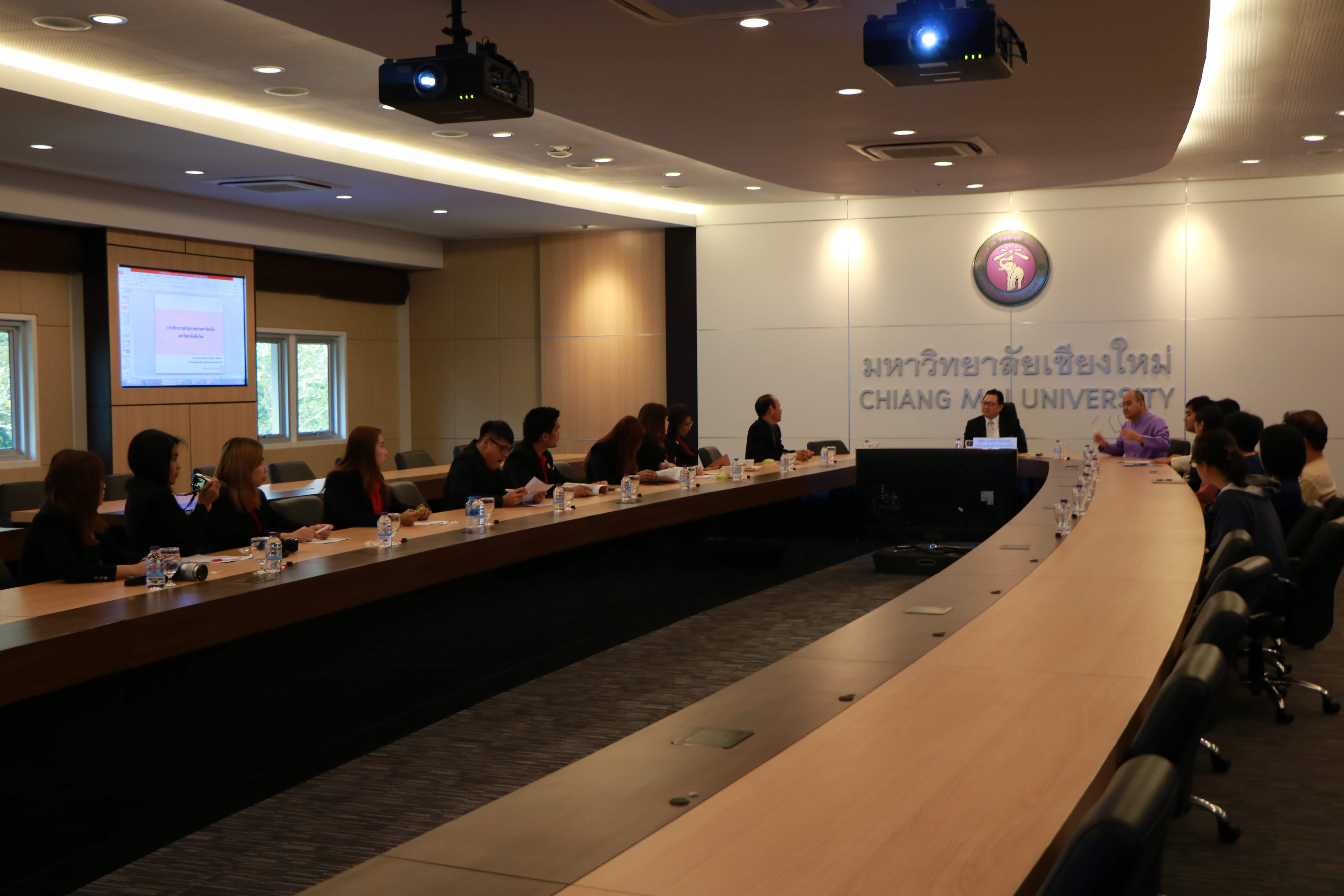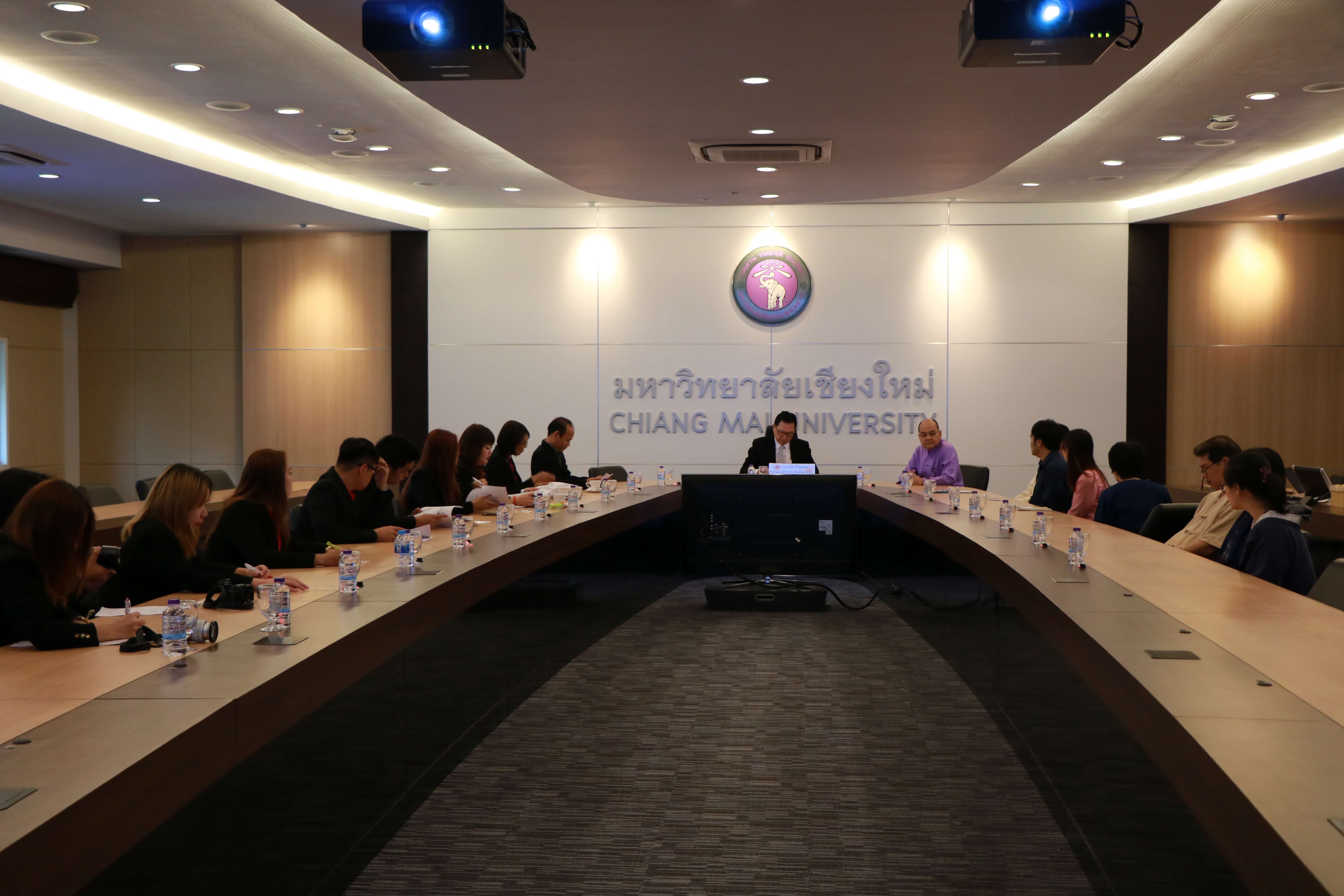 ศาสตราจารย์คลินิก นพ.ศุภชัย เชื้อรัตนพงษ์ รักษาการแทนรองอธิการบดีฝ่ายกิจการสภามหาวิทยาลัย และเจ้าหน้าที่สำนักงานสภามหาวิทยาลัย ต้อนรับ ผู้ช่วยศาสตราจารย์พิษณุ บางเขียว รองอธิการบดี ปฏิบัติหน้าที่เลขานุการสภามหาวิทยาลัย และคณะศึกษาดูงานจากมหาวิทยาลัยราชภัฏบ้านสมเด็จเจ้าพระยา เนื่องในโอกาสที่มาศึกษาดูงานสำนักงานสภามหาวิทยาลัยเชียงใหม่ ณ ห้องประชุมตะวัน กังวานพงศ์ อาคารยุทธศาสตร์ สำนักงานมหาวิทยาลัย มหาวิทยาลัยเชียงใหม่ ในวันที่ 23 กุมภาพันธ์ พ.ศ. 2561