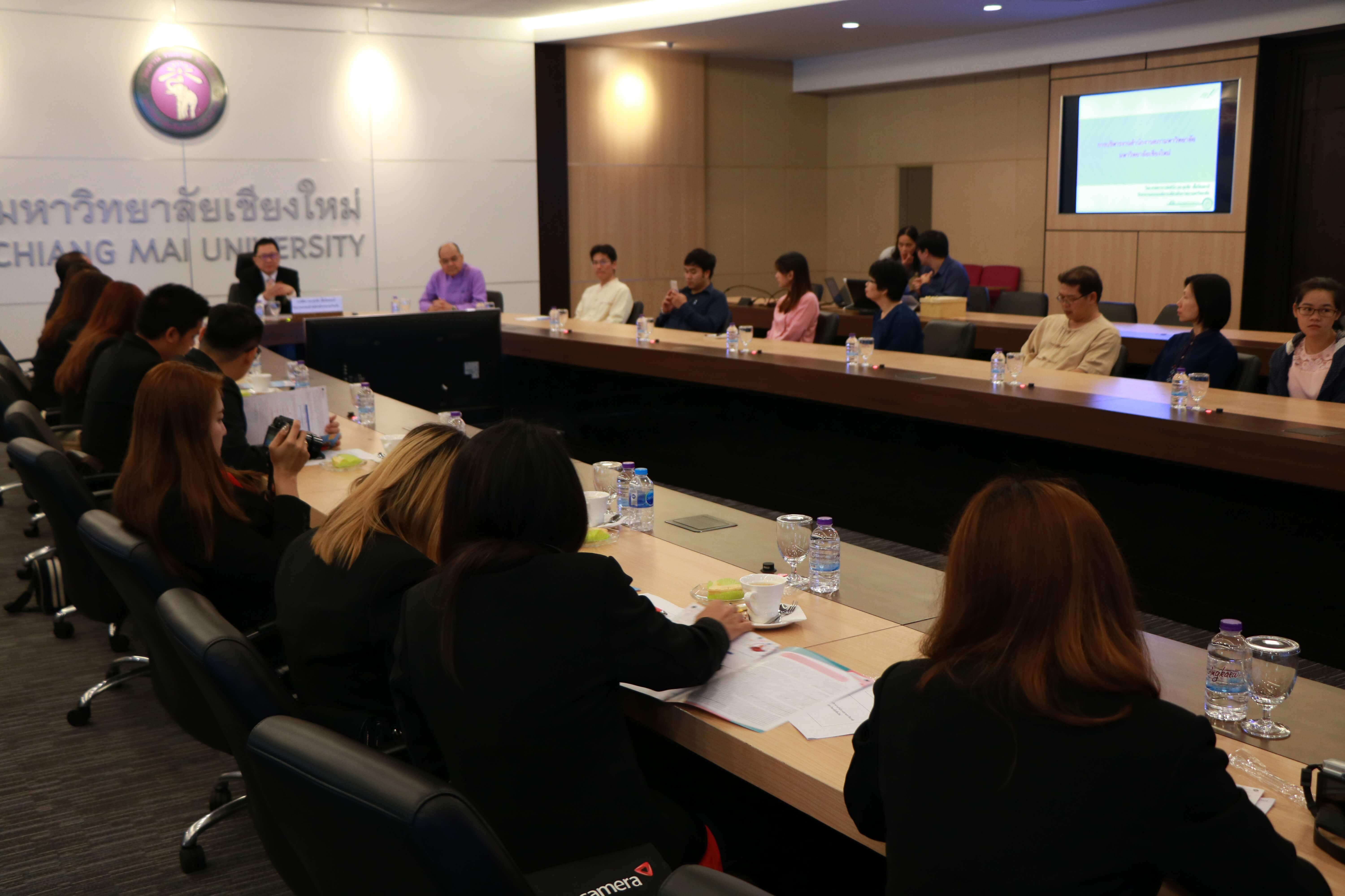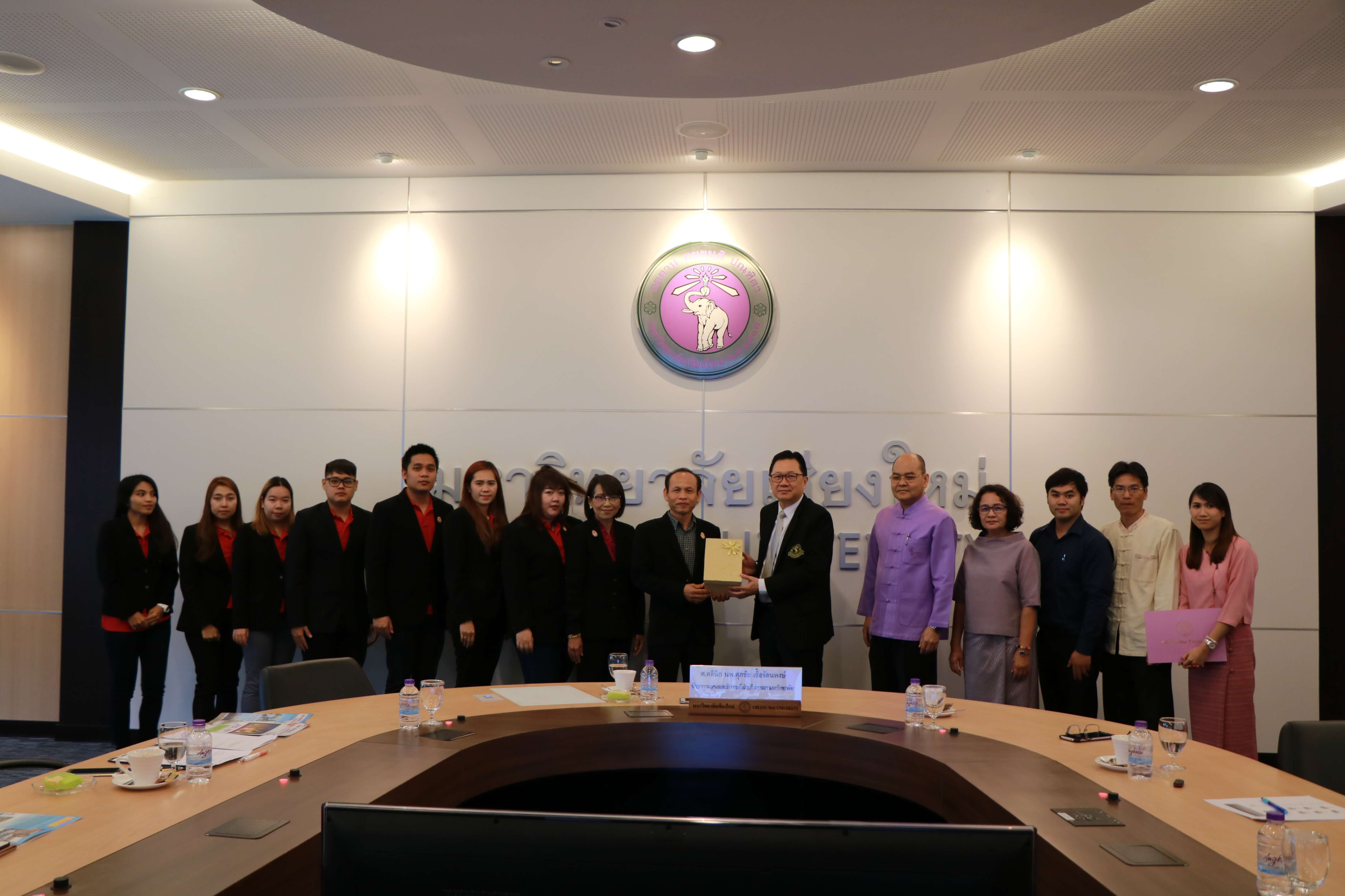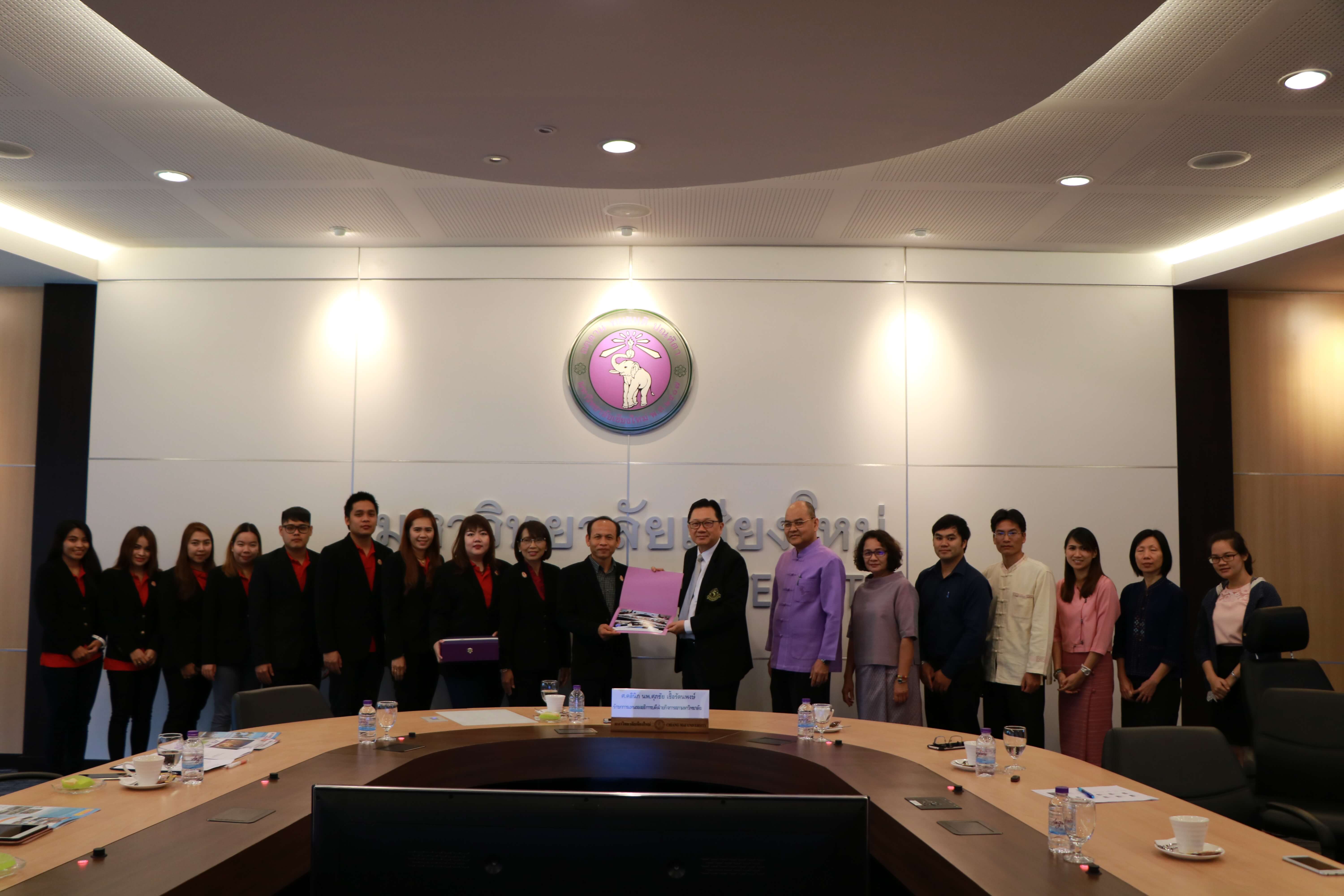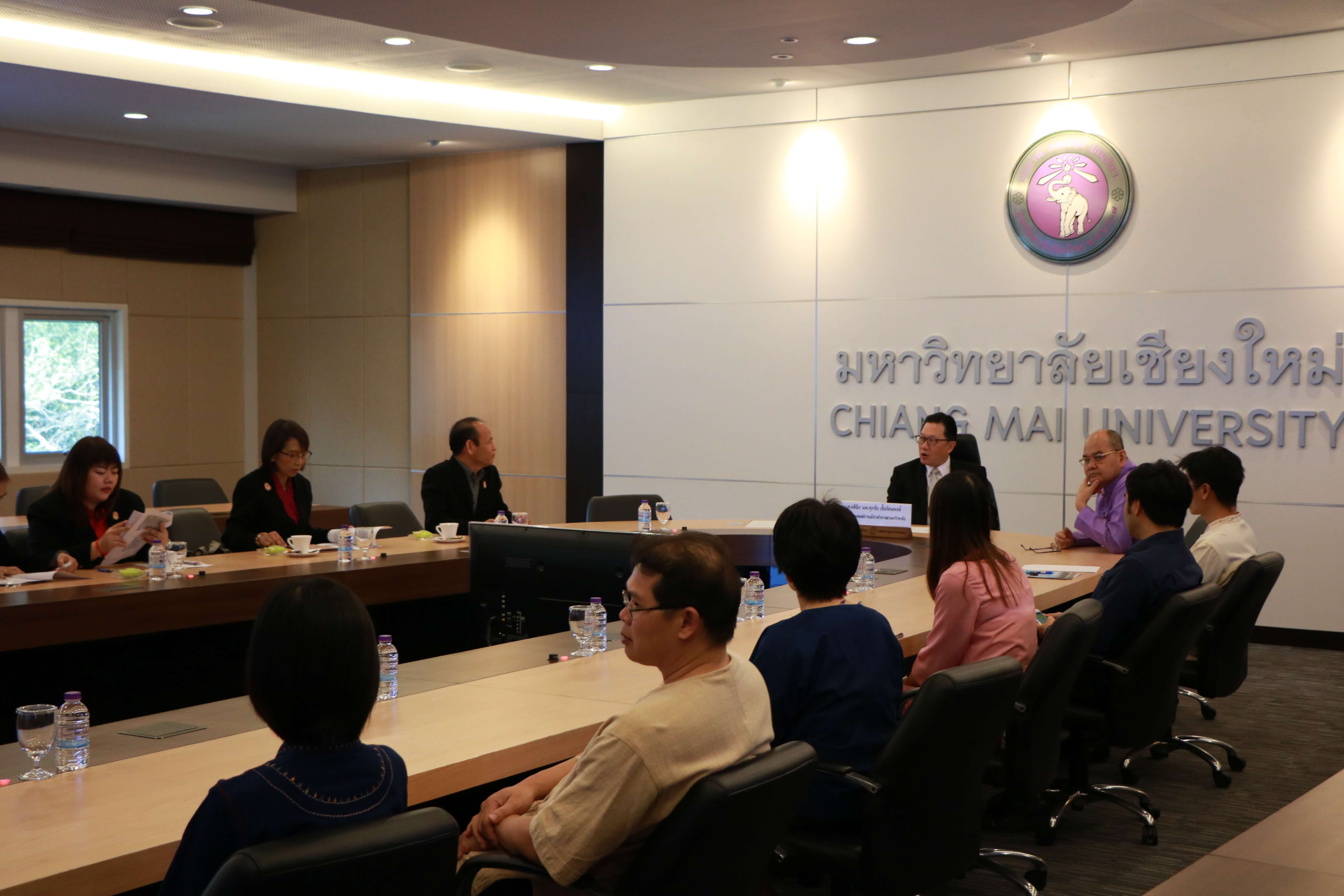ศาสตราจารย์คลินิก นพ.ศุภชัย เชื้อรัตนพงษ์ รักษาการแทนรองอธิการบดีฝ่ายกิจการสภามหาวิทยาลัย และเจ้าหน้าที่สำนักงานสภามหาวิทยาลัย ต้อนรับ ผู้ช่วยศาสตราจารย์พิษณุ บางเขียว รองอธิการบดี ปฏิบัติหน้าที่เลขานุการสภามหาวิทยาลัย และคณะศึกษาดูงานจากมหาวิทยาลัยราชภัฏบ้านสมเด็จเจ้าพระยา เนื่องในโอกาสที่มาศึกษาดูงานสำนักงานสภามหาวิทยาลัยเชียงใหม่ ณ ห้องประชุมตะวัน กังวานพงศ์ อาคารยุทธศาสตร์ สำนักงานมหาวิทยาลัย มหาวิทยาลัยเชียงใหม่ ในวันที่ 23 กุมภาพันธ์ พ.ศ. 2561