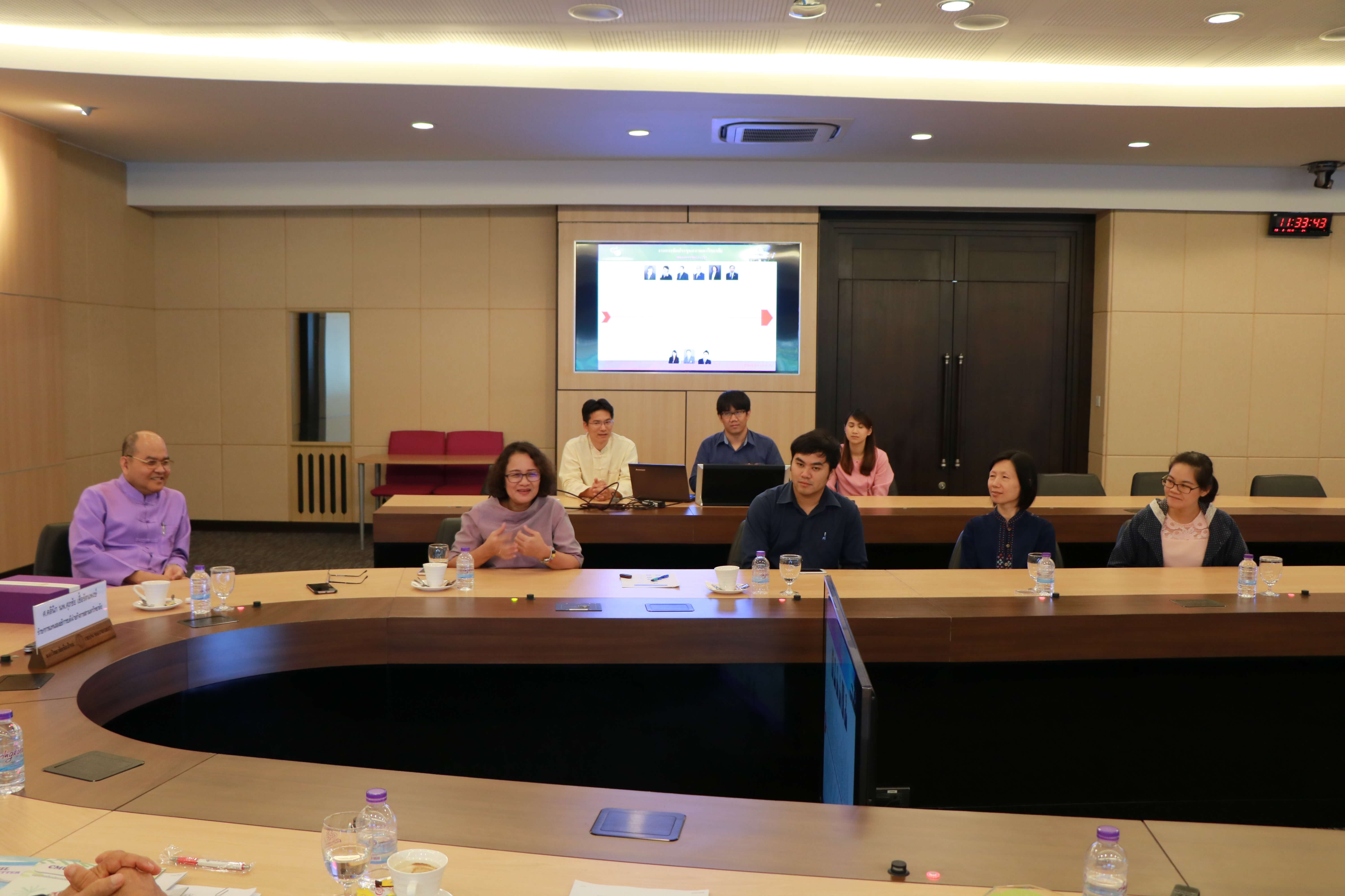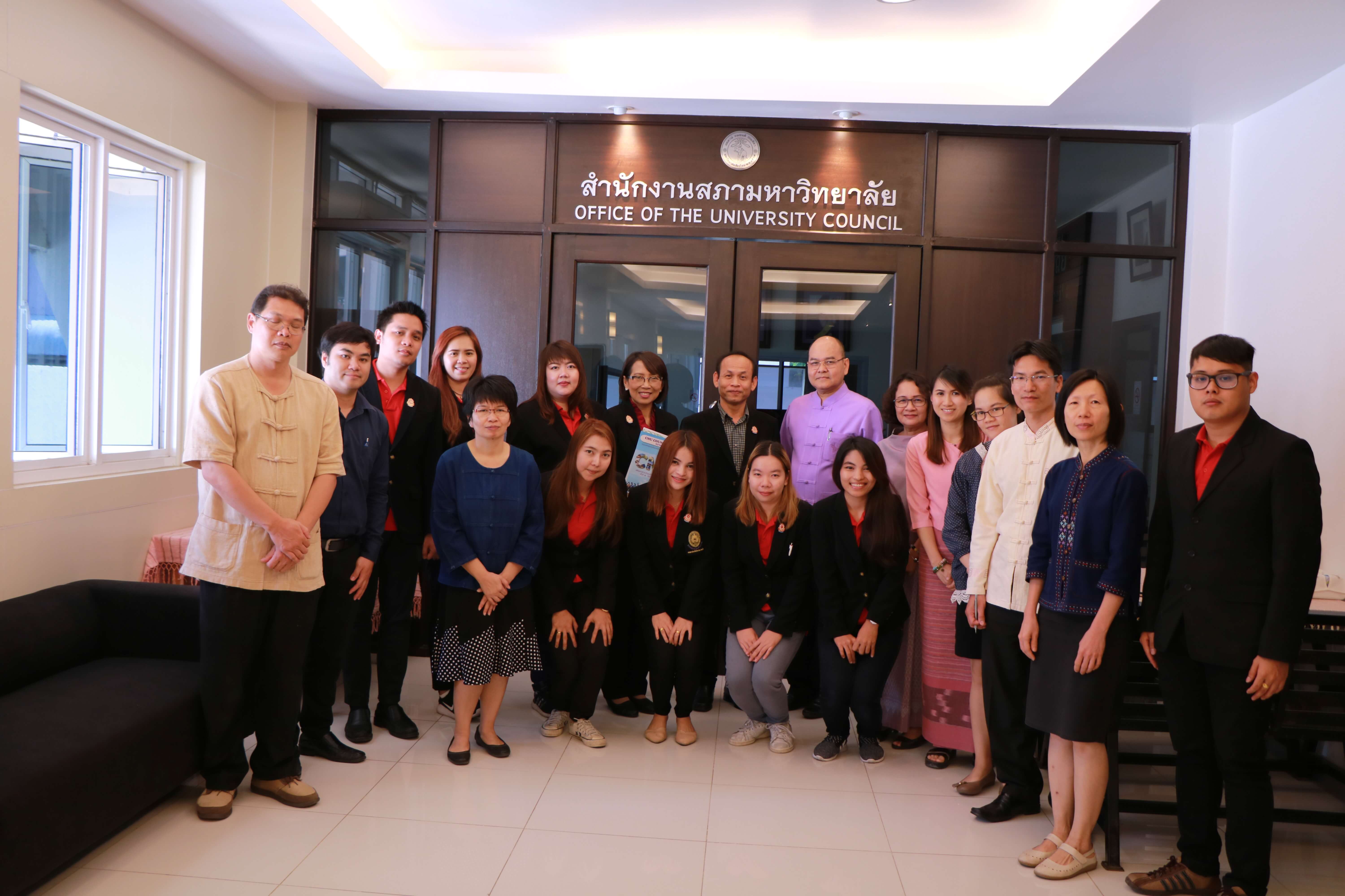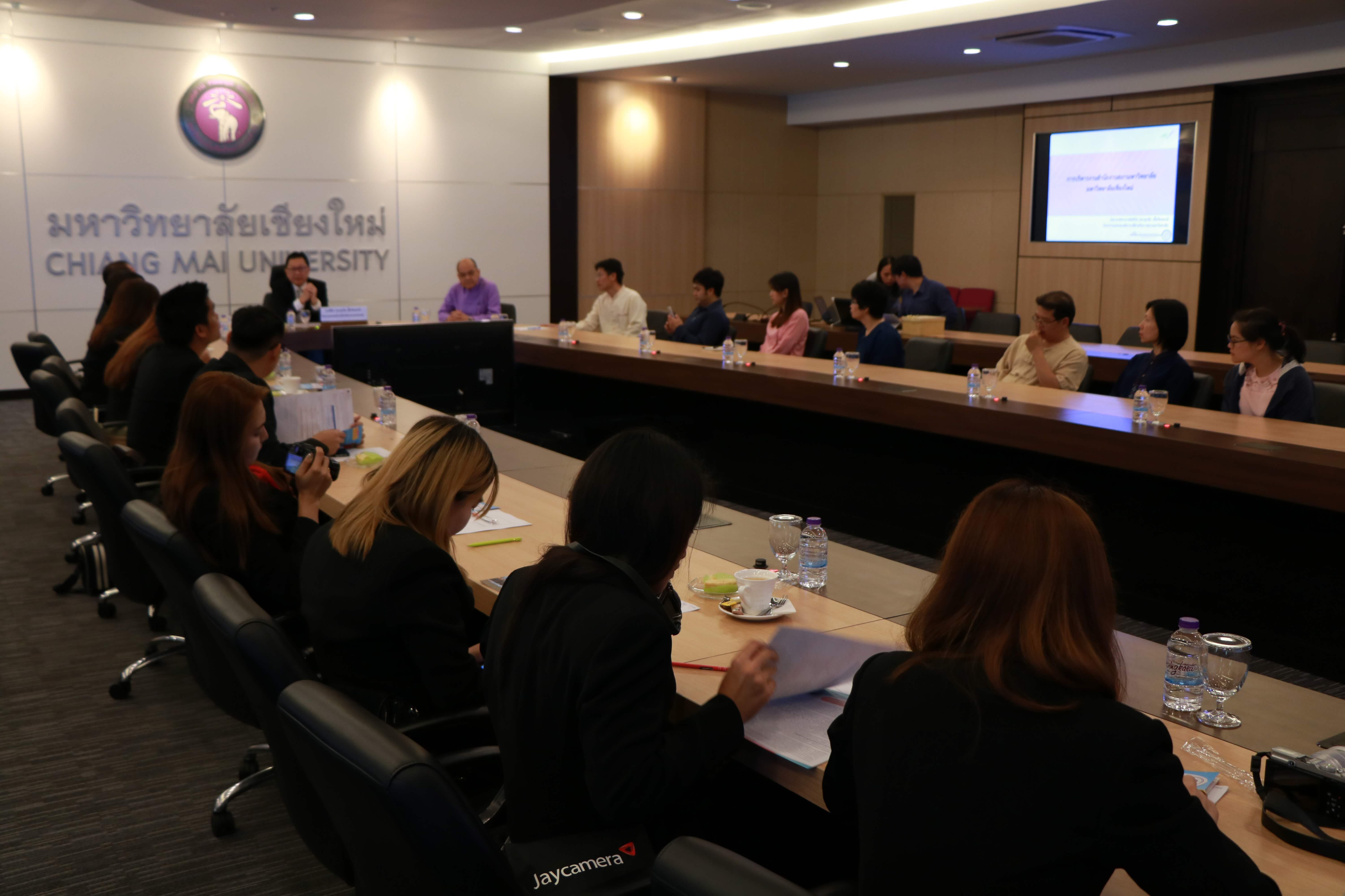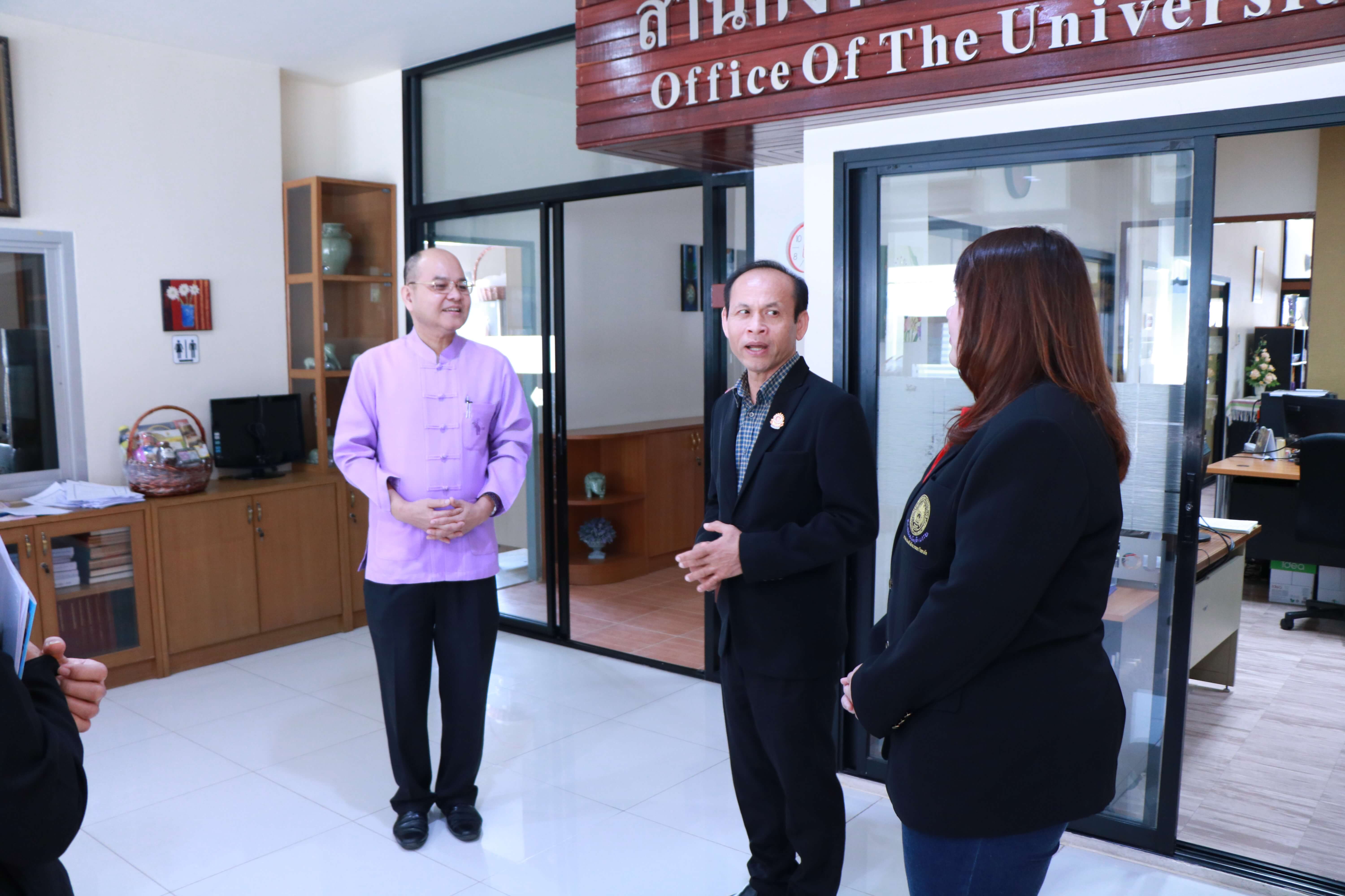 ศาสตราจารย์คลินิก นพ.ศุภชัย เชื้อรัตนพงษ์ รักษาการแทนรองอธิการบดีฝ่ายกิจการสภามหาวิทยาลัย และเจ้าหน้าที่สำนักงานสภามหาวิทยาลัย ต้อนรับ ผู้ช่วยศาสตราจารย์พิษณุ บางเขียว รองอธิการบดี ปฏิบัติหน้าที่เลขานุการสภามหาวิทยาลัย และคณะศึกษาดูงานจากมหาวิทยาลัยราชภัฏบ้านสมเด็จเจ้าพระยา เนื่องในโอกาสที่มาศึกษาดูงานสำนักงานสภามหาวิทยาลัยเชียงใหม่ ณ ห้องประชุมตะวัน กังวานพงศ์ อาคารยุทธศาสตร์ สำนักงานมหาวิทยาลัย มหาวิทยาลัยเชียงใหม่ ในวันที่ 23 กุมภาพันธ์ พ.ศ. 2561